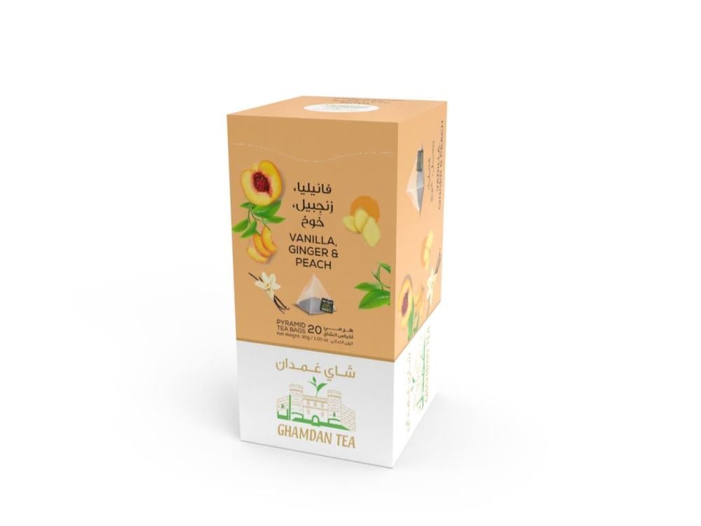Ghamdan tea, blended with vanilla, ginger, and peach, offers a unique experience combining the warmth of ginger, the smoothness of vanilla, and the natural sweetness of peach. A balanced flavor with an aromatic and fruity character, it's suitable for hot or cold consumption. Caffeine-free, it's perfect for relaxing anytime.